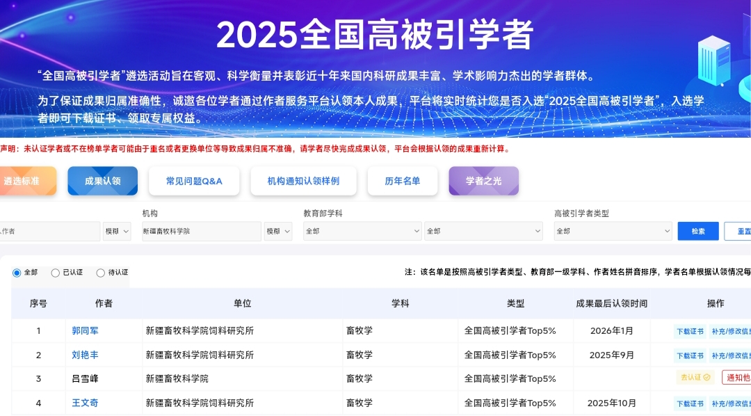 2026-01-07近日,中国知网·中国科学文献计量评价研究中心正式发布《2025全国高被引学者》名单,我院郭同军、王文奇、刘艳丰、吕雪峰4名研究员凭借其在畜牧学领域的突出学术贡献,...